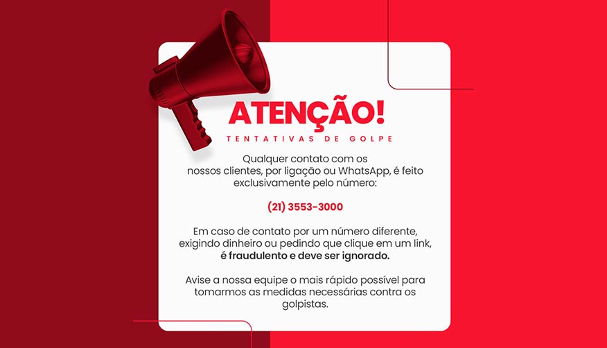 Qualquer contato com os nossos clientes, por ligação ou WhatsApp, é feito exclusivamente pelo número (21) 3553-3000 Em caso de contato por um número diferente, exigindo dinheiro ou pedindo que clique em um link, é fraudulento e deve ser ignorado. Avise a nossa equipe o mais rápido possível para tomarmos as medidas necessárias contra os […]