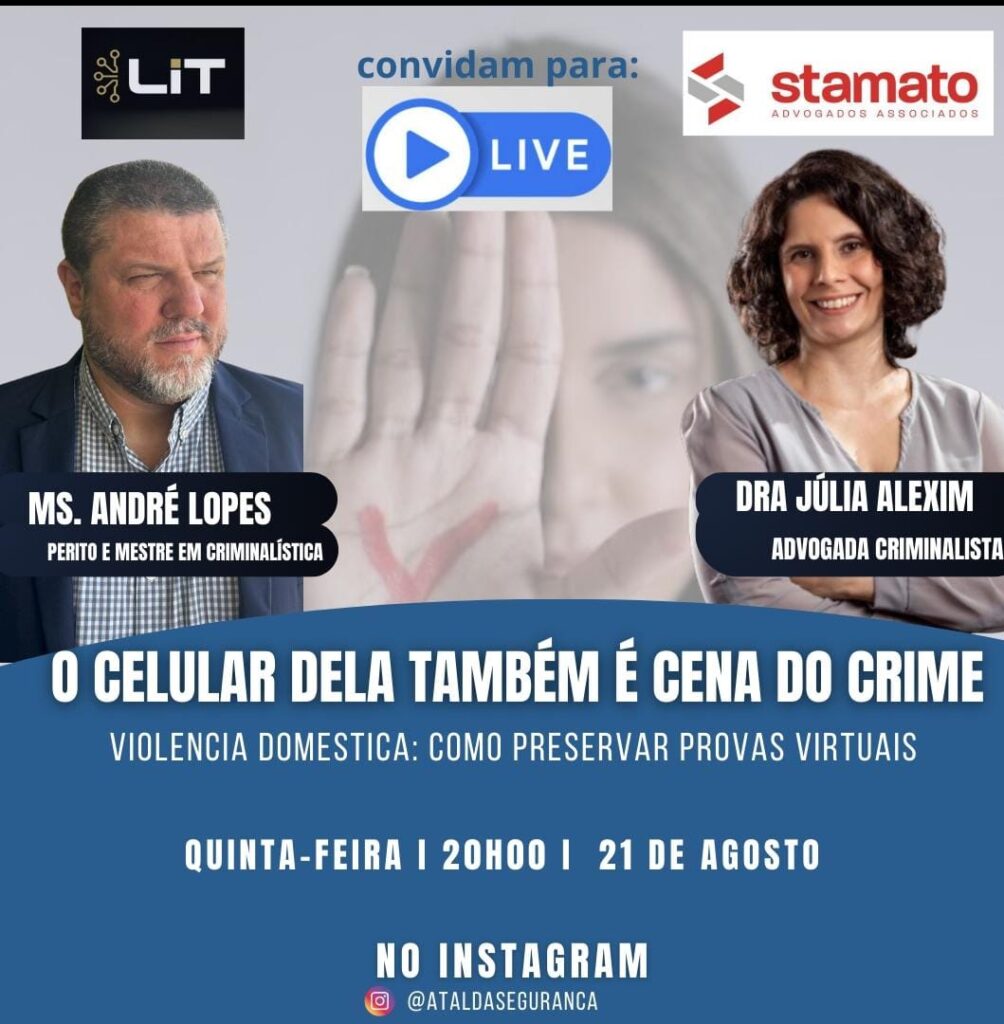 No dia 21 de agosto próximo nossa sócia Julia Alexim, advogada criminalista, participará de uma live no canal A tal da Segurança, do Perito e Mestre em Criminalística André Lopes, para falar sobre provas virtuais e violência doméstica. São mensagens, fotos, áudios, vídeos e até registros de localização que podem ser cruciais para a investigação […]